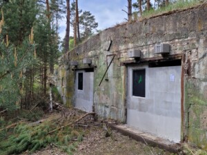20250506_154214.jpg Doppelbunker rechts: Zwei Öffnungen wurden geschlossen und verputzt. Dabei wurde ein Einflugspalt am oberen Rand ausgespart. In jede Mauersteinwand wurde eine einbruchssichere Stahltür eingearbeitet. Foto: Marta Smigrowska-Mohn
